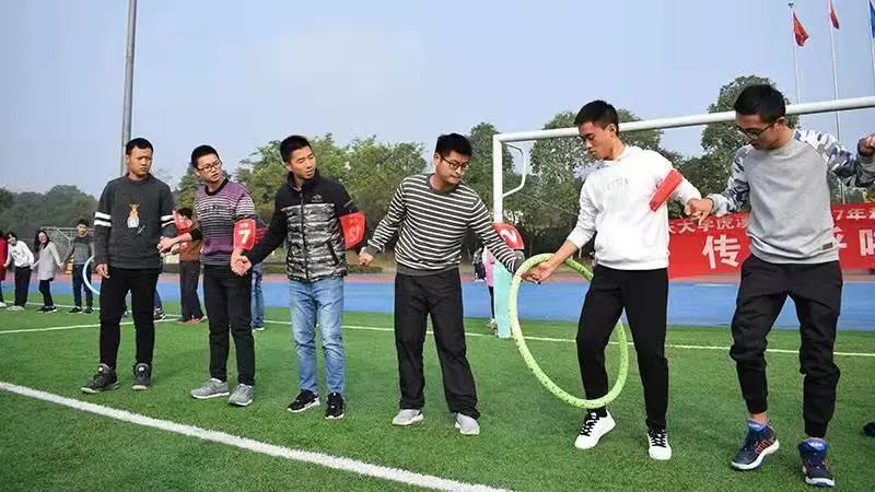 规则:要求每支队伍手拉手站成一排,从第一个人开始将呼啦圈依次穿过四个人的身体,期间要保持拉手状态,全部传递完成后,最后一个人需要在指定距离外把呼啦圈向前抛出并套在指定物品上。