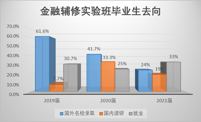 迄今为止,金贸学院金融辅修实验班已招收五届,共计学生400余名。涉及英语、法语、德语、俄语、西班牙语、日语、阿拉伯语、韩语、泰语、意大利语等20多个语种。在新冠疫情导致经济下行压力的大背景下,2021届毕业生依然展现了极高的求学与择业竞争力,得到了国内外众多名校、企事业单位的广泛认可。目前,已有24%的同学被英美澳等名校录取,33%的同学拿到四大、银行等知名企事业单位的优质offer,还有19%的同学被国内名校录取。
