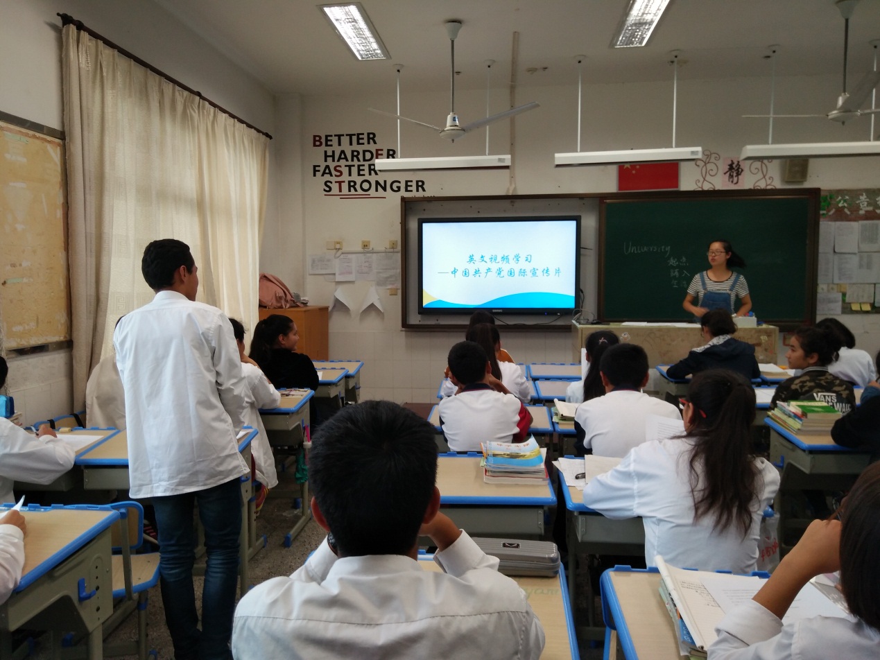 第一堂课中,入党积极分子与同学们分享了丰富多彩的大学生活,他们主要以上海外国语大学为模板向同学们展现了大学的景象并与同学们交流了对于大学的展望。接着,第二堂课中,他们秉承教学的理念,放映了令人振奋的中国共产党的国际宣传片《中国共产党与你一起在路上》。该视频体现了中国共产党把中国每个百姓的梦想作为自己的奋斗目标,在前进的道路上愿与世界同行共赢的信念和决心。通过入党积极分子的悉心讲解,同学们不仅从短片中习得了英语知识,也了解到中国共产党为新中国建设所做的巨大贡献。