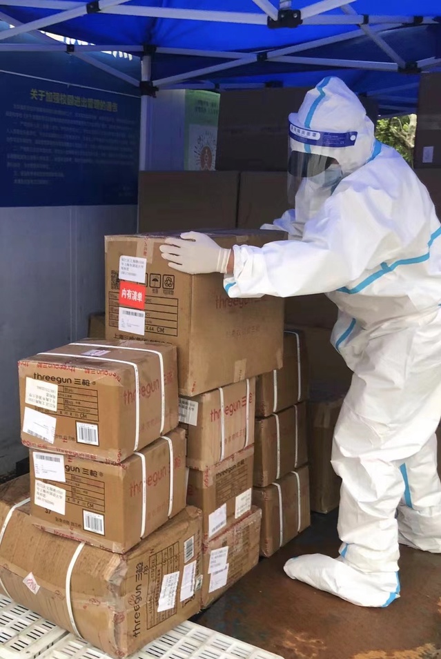4月30日,国际金融贸易学院金融专业硕士项目中心企业导师,上海三毛集团原党委书记、财务总监朱建忠向我校捐赠1500件防疫针织品。朱建忠同志长期参与专业硕士项目中心的人才培养工作,此次疫情以来更是一直与学院保持着密切的联系。他在得知学校防护及生活物资短缺的状况,立即出资购买千余件防疫针织品支援我校疫情防控工作。感谢朱建忠同志用真情传递抗“疫”正能量,为学校疫情防控及后勤保障工作贡献力量。