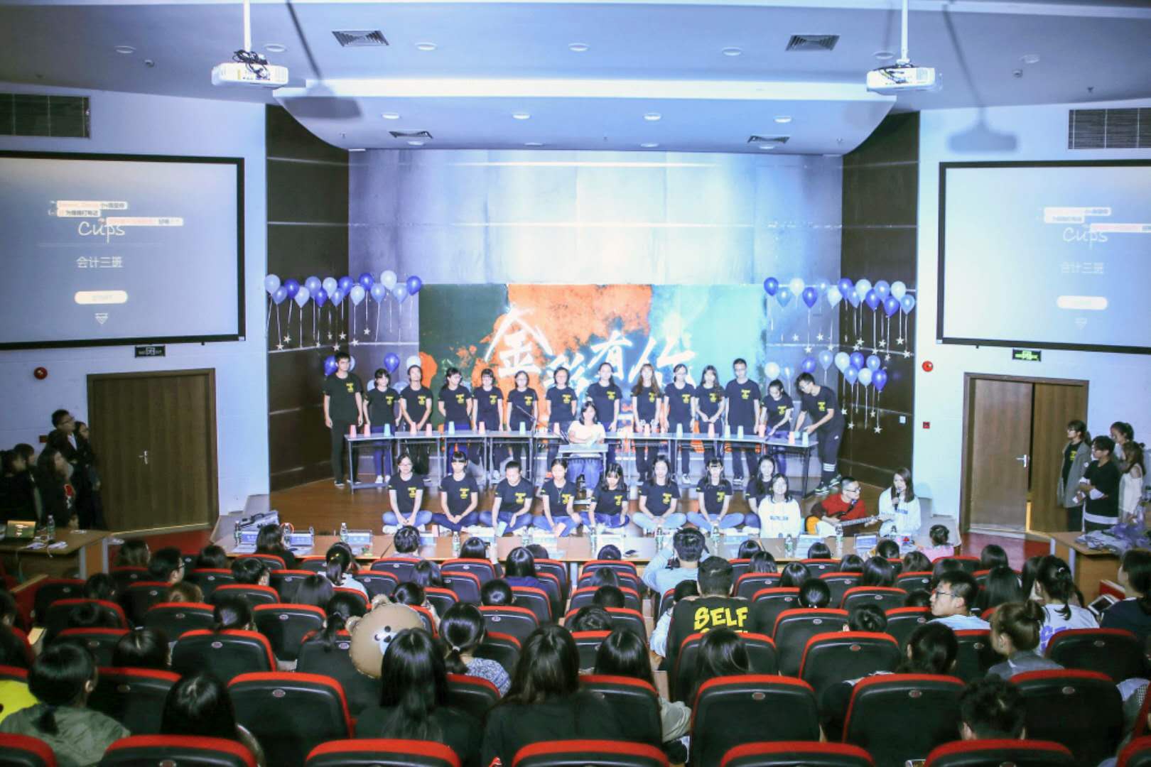 压轴出场的会计三班,以一曲节奏感十足的《Cups》,将晚会推向了最高潮,杯子的敲击、彼此的击掌,眼神的交换,让年轻的血液沸腾起来。