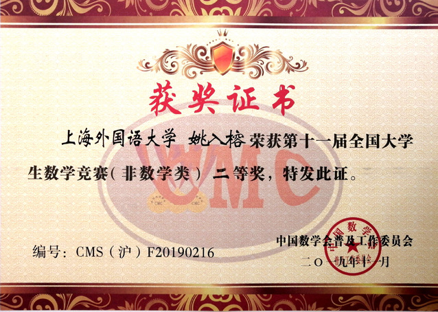 2019年12月27日,第十一届全国大学生数学竞赛上海赛区颁奖大会在华东师范大学举行。上海外国语大学国际金融贸易学院姚入榕和程仁浩同学,分别获得非数学类二等奖和三等奖,日语学院刘汝一同学获得非数学类二等奖。
